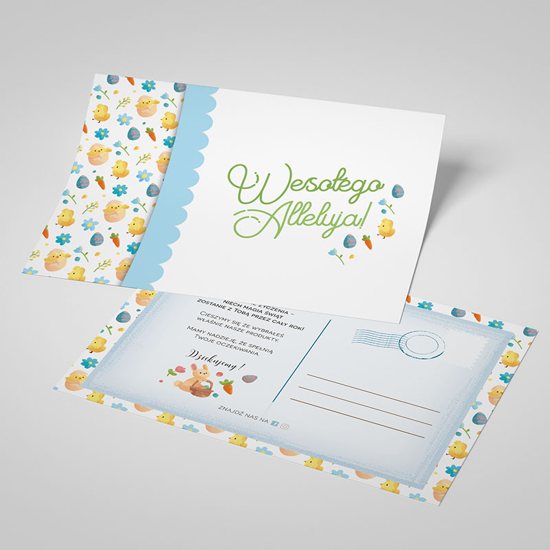 Wielkanocna kartka z uroczym motywem żółtych kurczaczków i marchewki, która serdecznie dziękuje za zakupy i składa radosne życzenia świąteczne. Wesoły, kolorowy design wprowadza w radosny, wiosenny nastrój, idealny jako dołącznik do zamówień lub prezentów, budujący pozytywne relacje z klientami w świątecznym czasie.